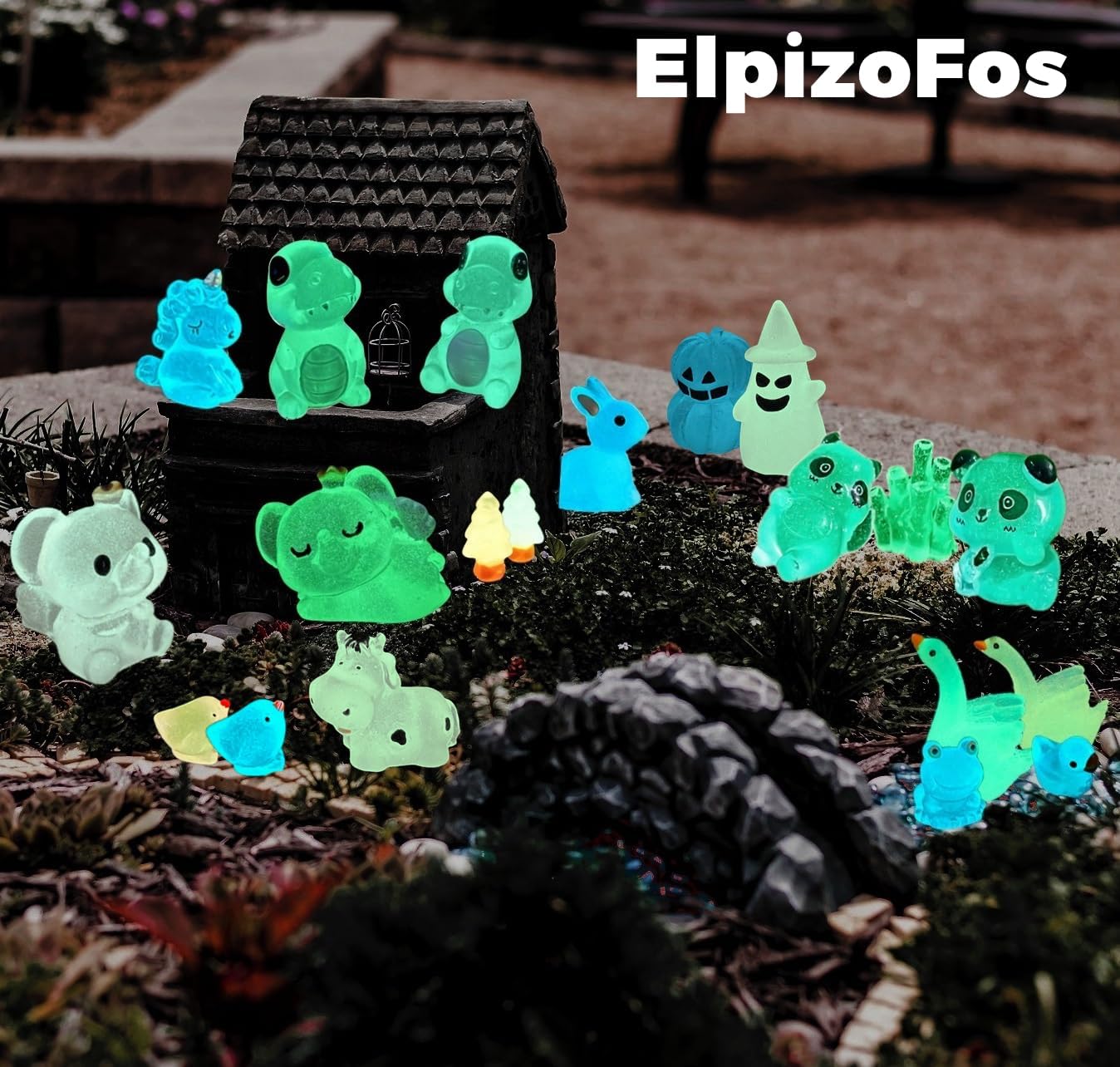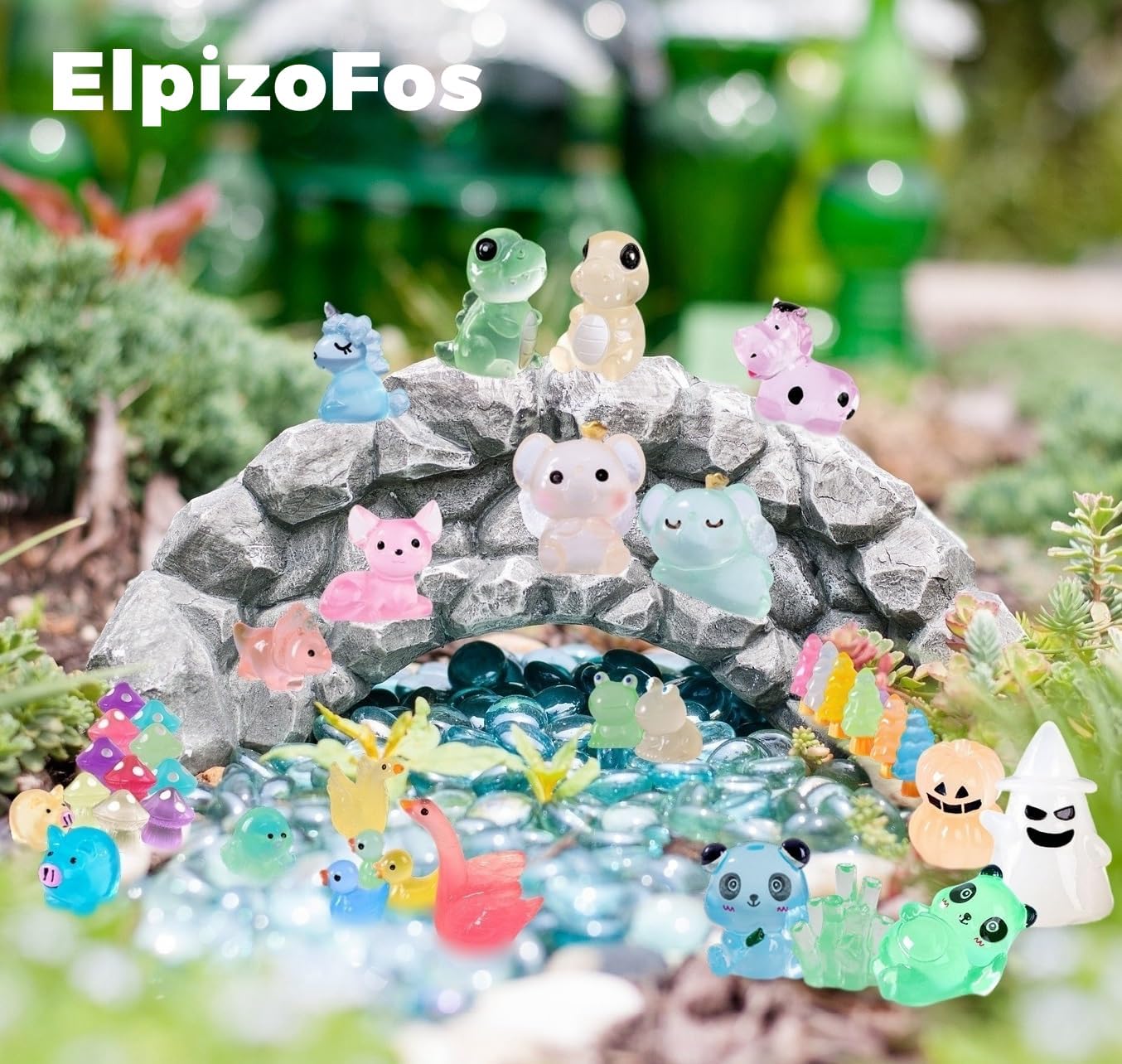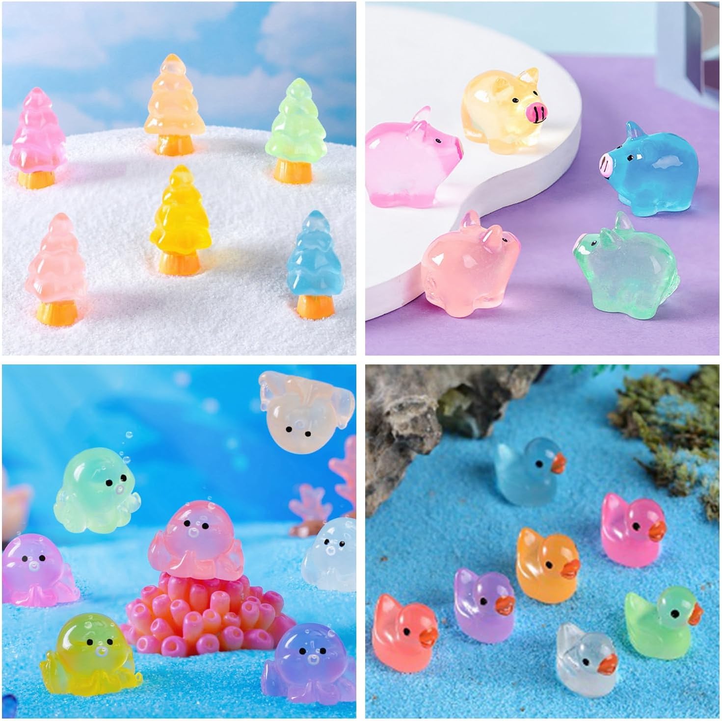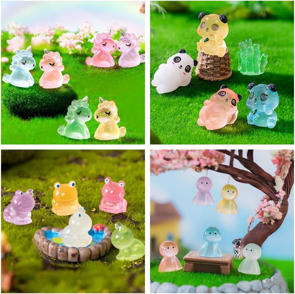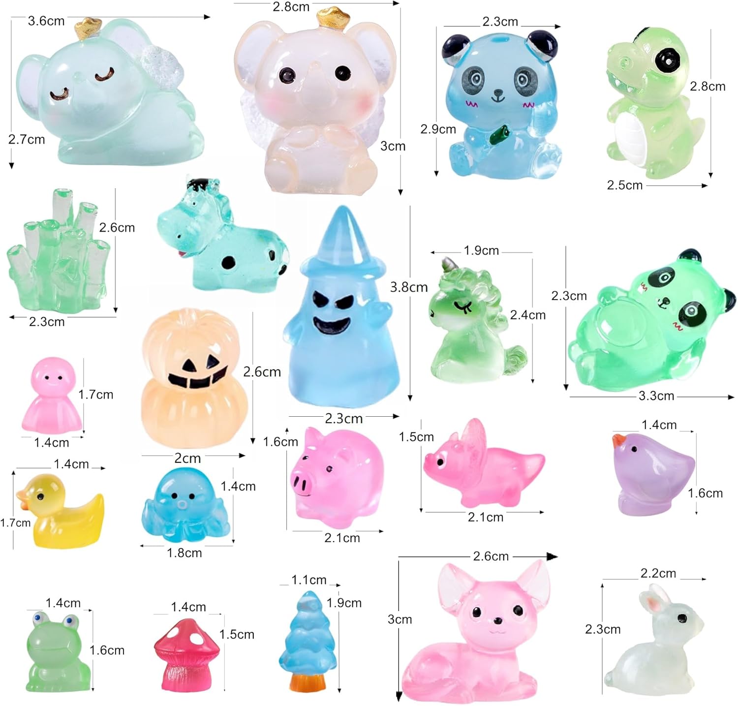 130pcs Various Luminous Animal Figurines. Glowing in The Dark Fairy Garden Accessories. Which include:Panda,Bear,Dinosaur,Unicorn,Frog,Triceratops,Chick,Duck,Swan,Mushroom,Rabbit,Pig,Christmas Tree,Sunny Doll,Sheep,Octopus.and all the Figurines shown in the main image.