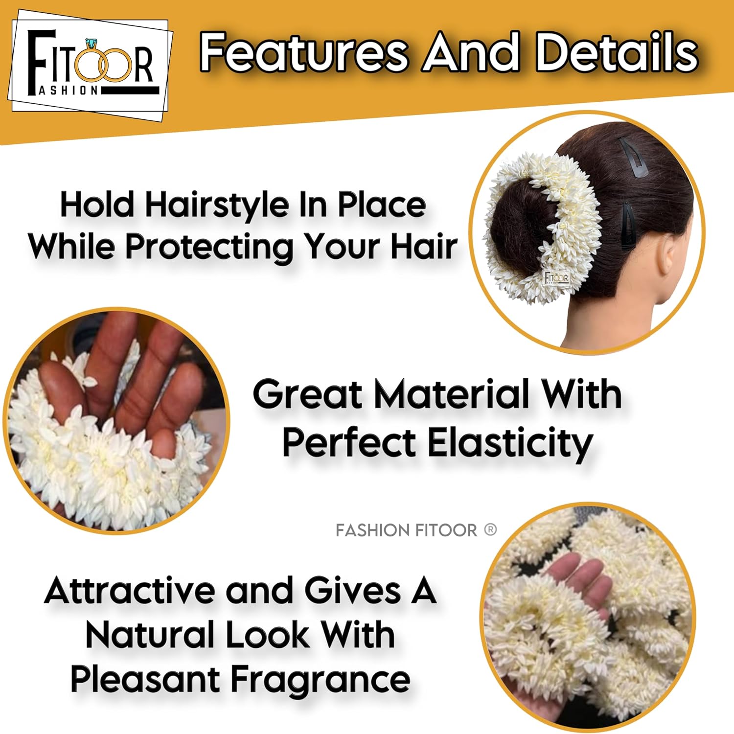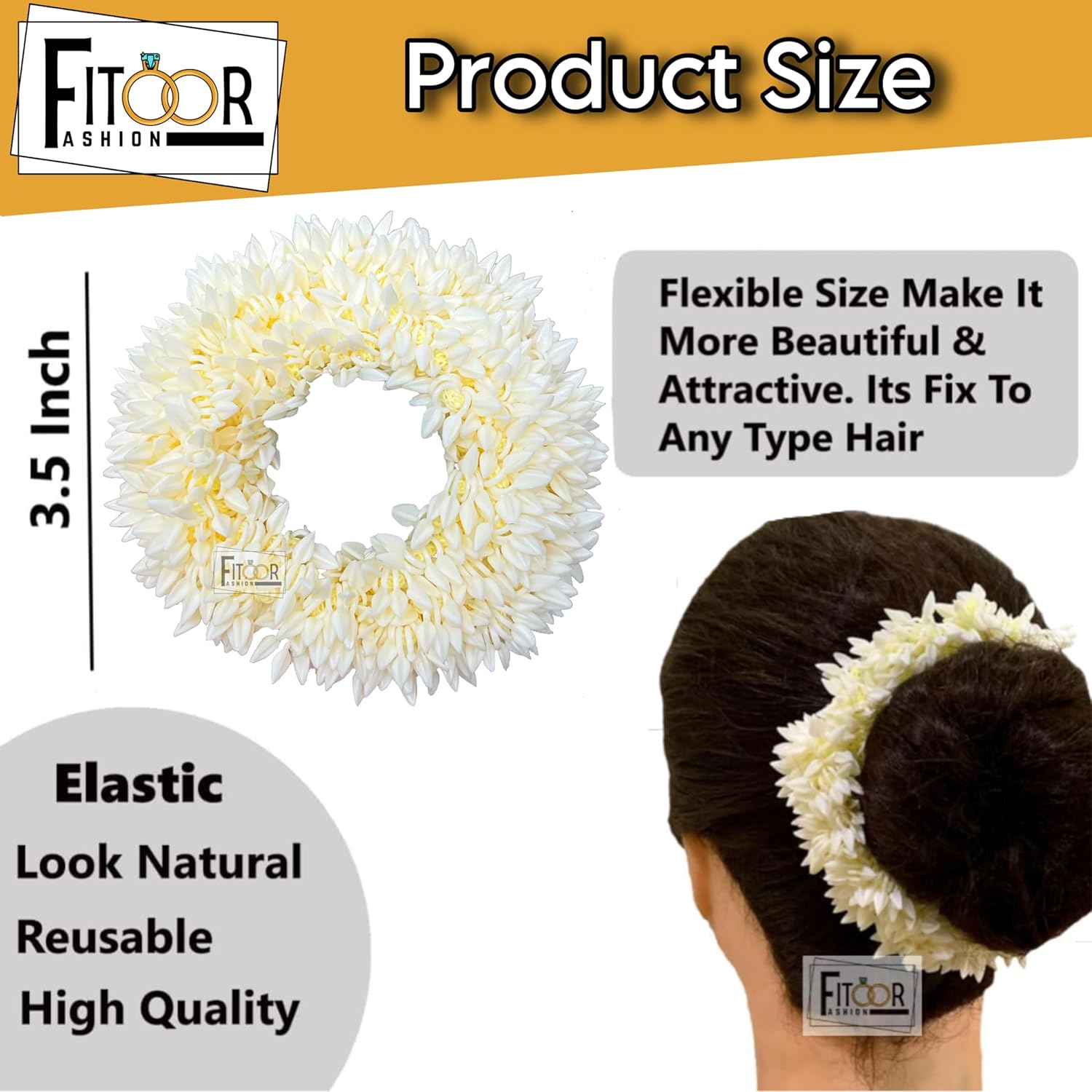 Beautiful artificial hair gajra for the bun. Inspired by South Indian brides. Made by bridal flower jewellery. Specially Made Hair Accessories For South indian Weddings. It is Used for Wedding, Bharatanatyam Dance, Seasonal Occasion Like Pongal, Diwali Etc. Girls can ties it Round their Pony Tail, Braids and Buns also. Its Gives a Attractive Look and go With Long and Shorts Hairs. Hair Accessories Gajra Adds a Charming Look When Worn on a Bun. The simple single stranded bun hairstyle with Flower Gajra is a Classic. It looks Best When Worn with An traditional Indian sari. This is a Reusable Product. The makeup needs to be kept bold while you need to contrast the white Hair Accessories. This is a Beautiful Gifting Product.