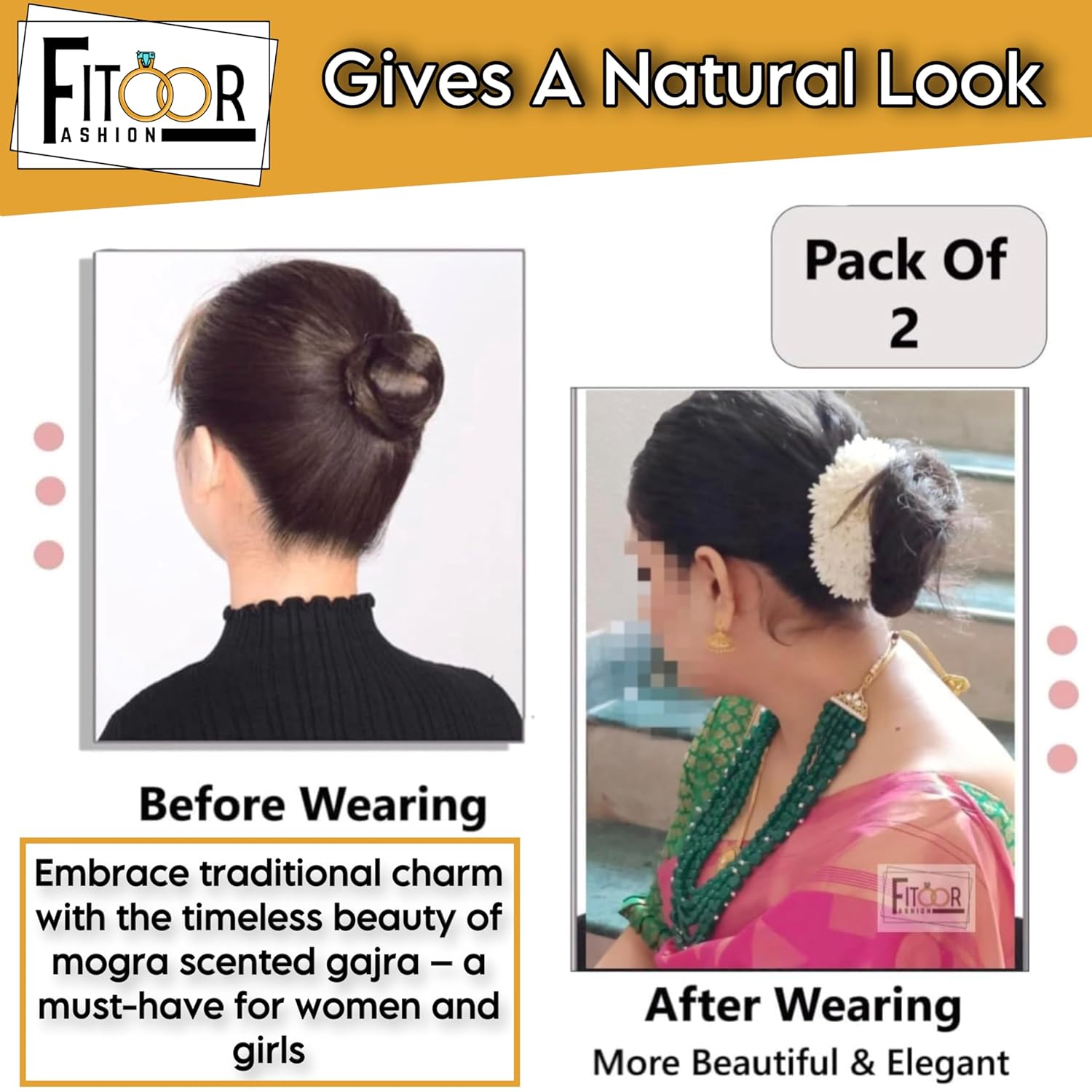 When Worn on a Bun. The simple single stranded bun hairstyle with Flower Gajra is a Classic. It looks Best When Worn with An traditional Indian sari. This is a Reusable Product.