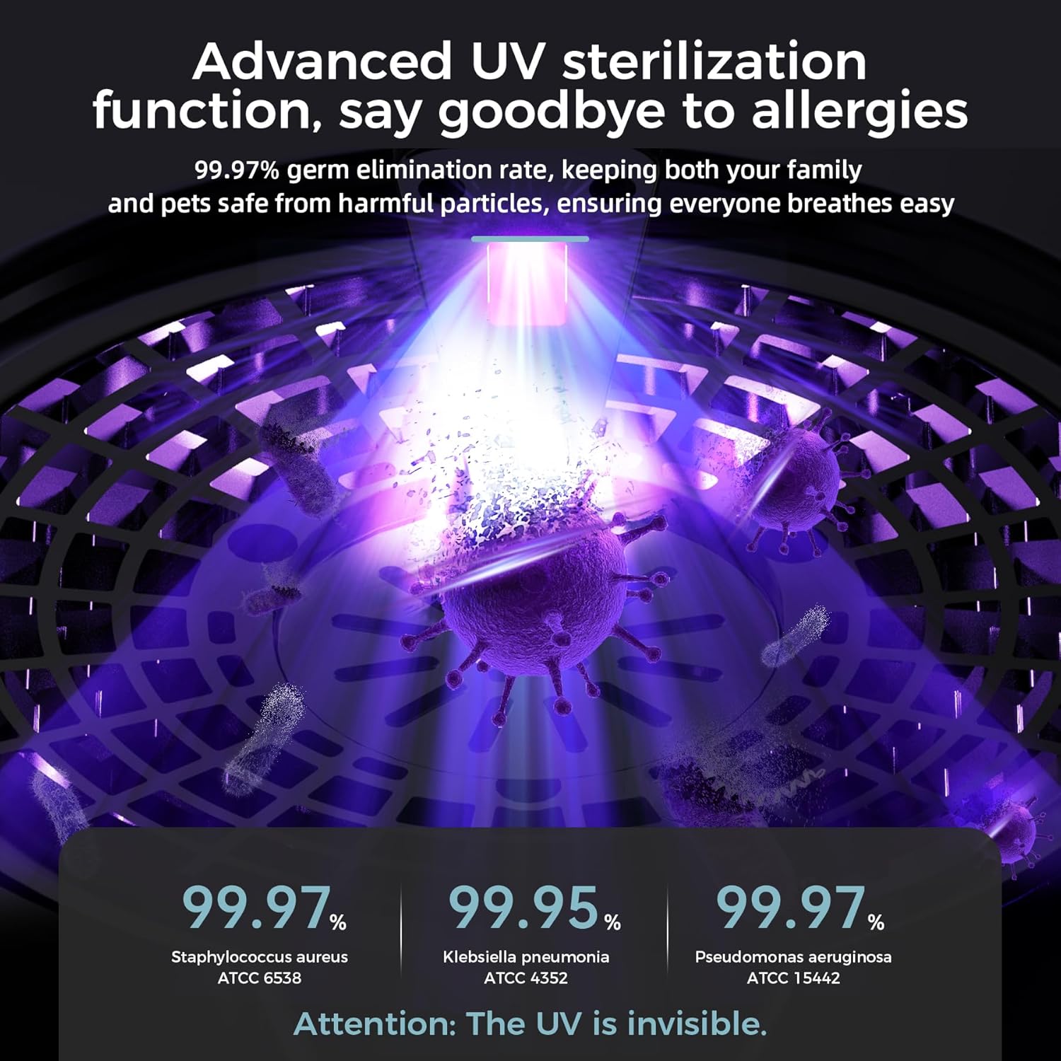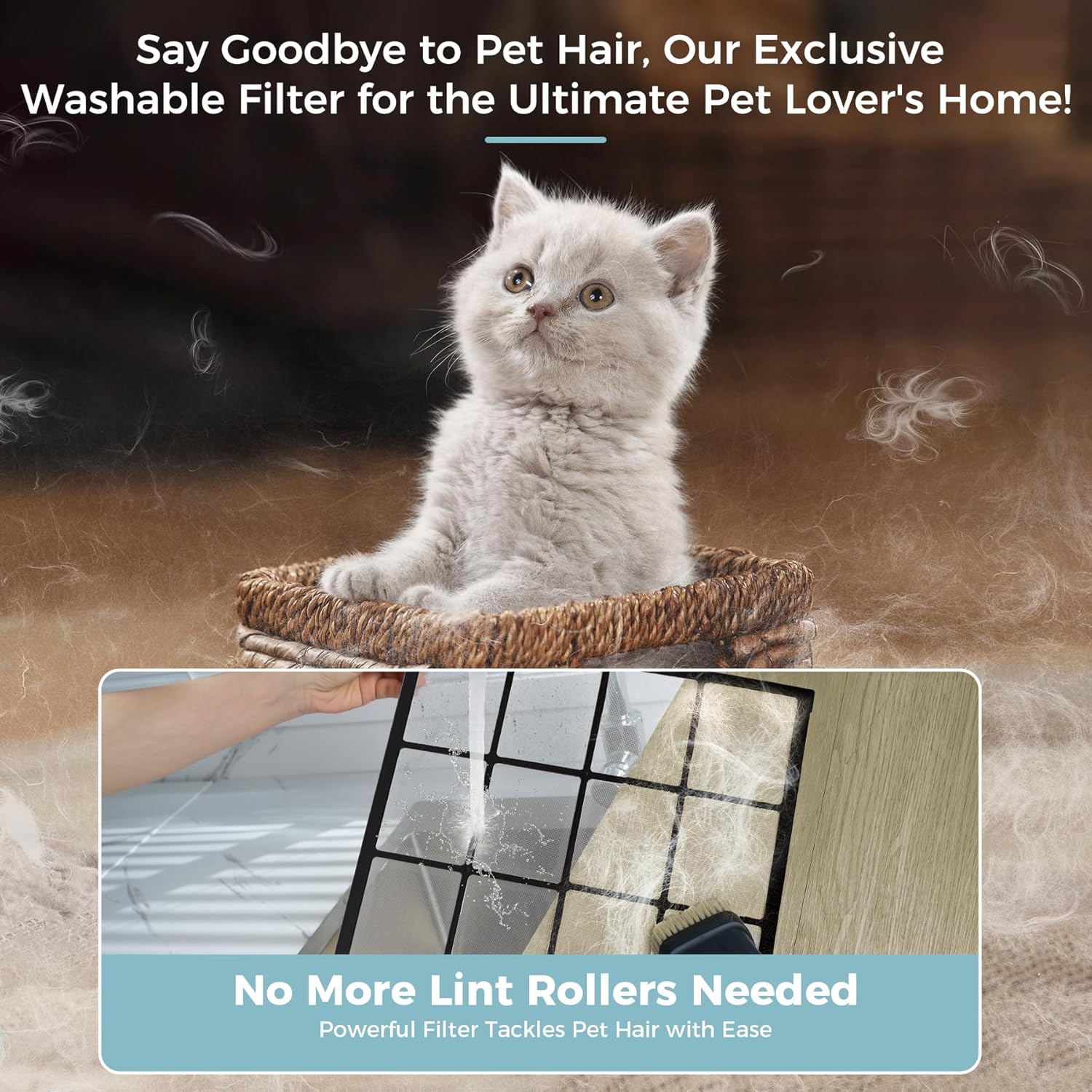Comprehensive Defense: This air purifiers, equipped with activated carbon, and a pre-filter, effectively removing particles and odors. The Filter captures pet dander and pollen, while activated carbon neutralizes odors, smoke. The washable filter included blocks pet hair, extending its lifespan for all-around purification