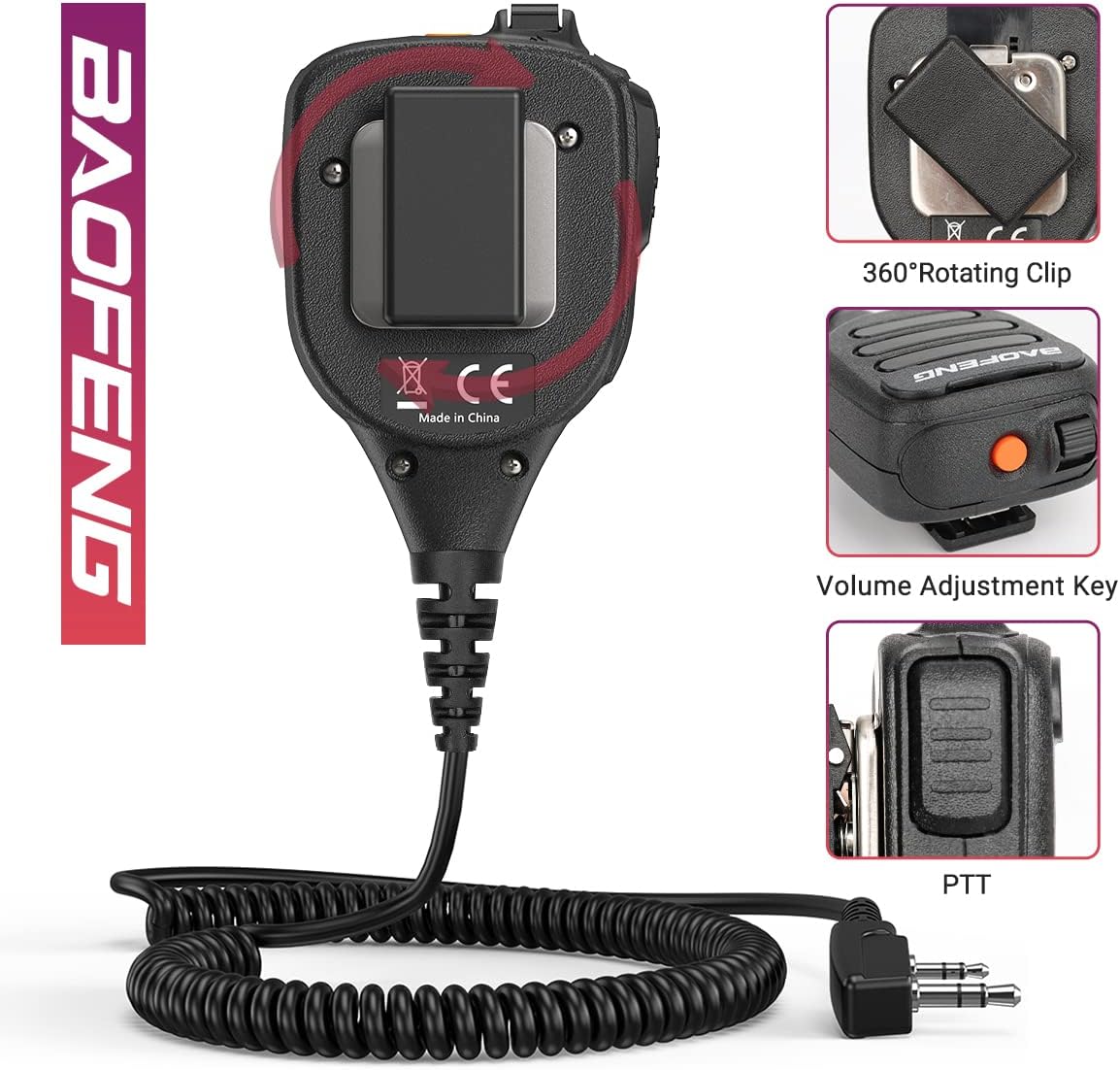 Baofeng Shoulder Speaker Microphone with durable 360° rotable clip.It is more convenient to use, and can be fixed on the car, shoulder, bag, waist, and anywhere.