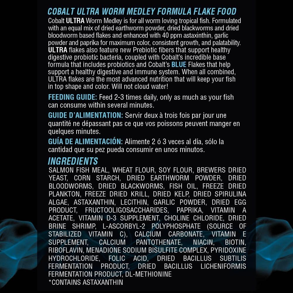 Cobalt ULTRA Worm Medley is for all worm loving tropical fish. Formulated with an equal mix of dried earthworm powder, dried blackworms and dried bloodworm based flakes and enhanced with 40 ppm astaxinthin, garlic powder and paprika for maximum color, consistent growth, and palatability. ULTRA flakes also feature new Prebiotic fibers that support healthy digestive probiotic bacteria, coupled with Cobalt’s incredible base formula that includes probiotics and Cobalt’s BLUE Flakes that help support a healthy digestive and immune system. When all combined, ULTRA flakes are the most advanced nutrition that will keep your fish in top shape and color. Will not cloud water!