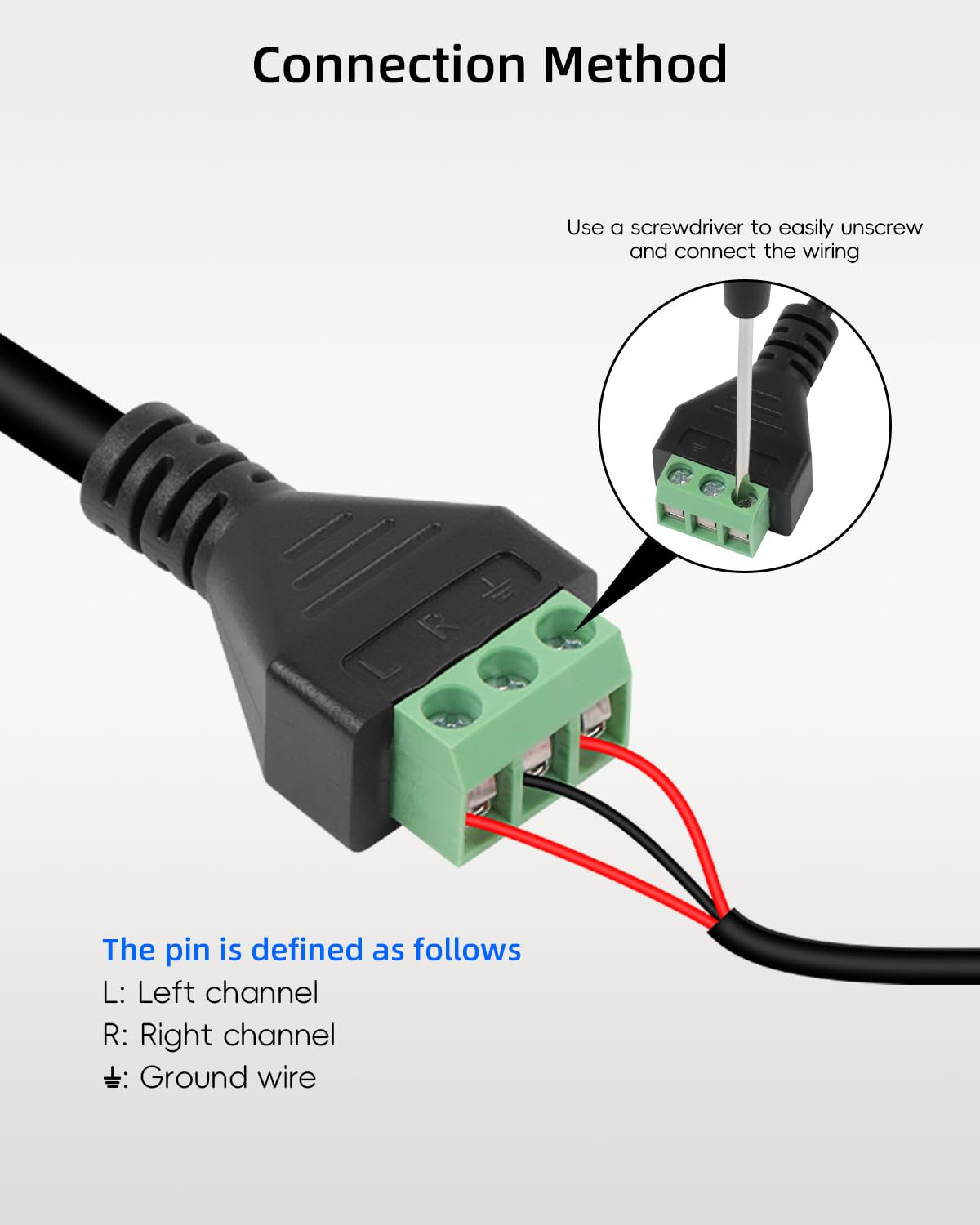 Easy to disassemble and maintain: Very flexible to use, no need for solder and welding tools, the terminals are clearly marked, and only need to use a screwdriver to fix the screws to connect. L interface: connect to the left channel; R interface: connect to the right channel; 〨 Interface: grounding wire; Attention: Please do not connect to the wrong interface