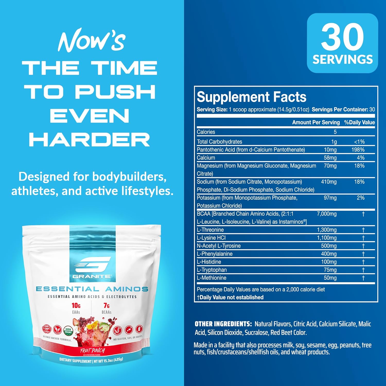 Stronger Starts Here: Power your performance with Granite EAAs, the ultimate BCAA and EAA amino acids powder. Each serving provides essential nutrients your body needs after an intense, sweaty workout.