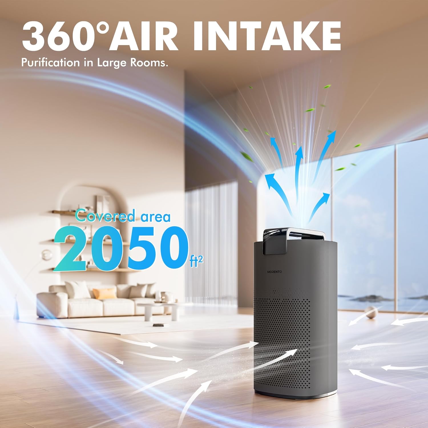 【Large & Powerful Air Purifier】 MORENTO Air Purifier – A powerful large room air purifier for home use, the product size is 12.7*12.7*24.4in, Purify a wider range of air purity. The air purification rate is up to CADR 460m³/h, CFM is 270, 4-in-1 all-around purification, and it effectively cleans the air in the room of 2,050 Ft² /190m² per hour. You can always enjoy fresh air wherever you are