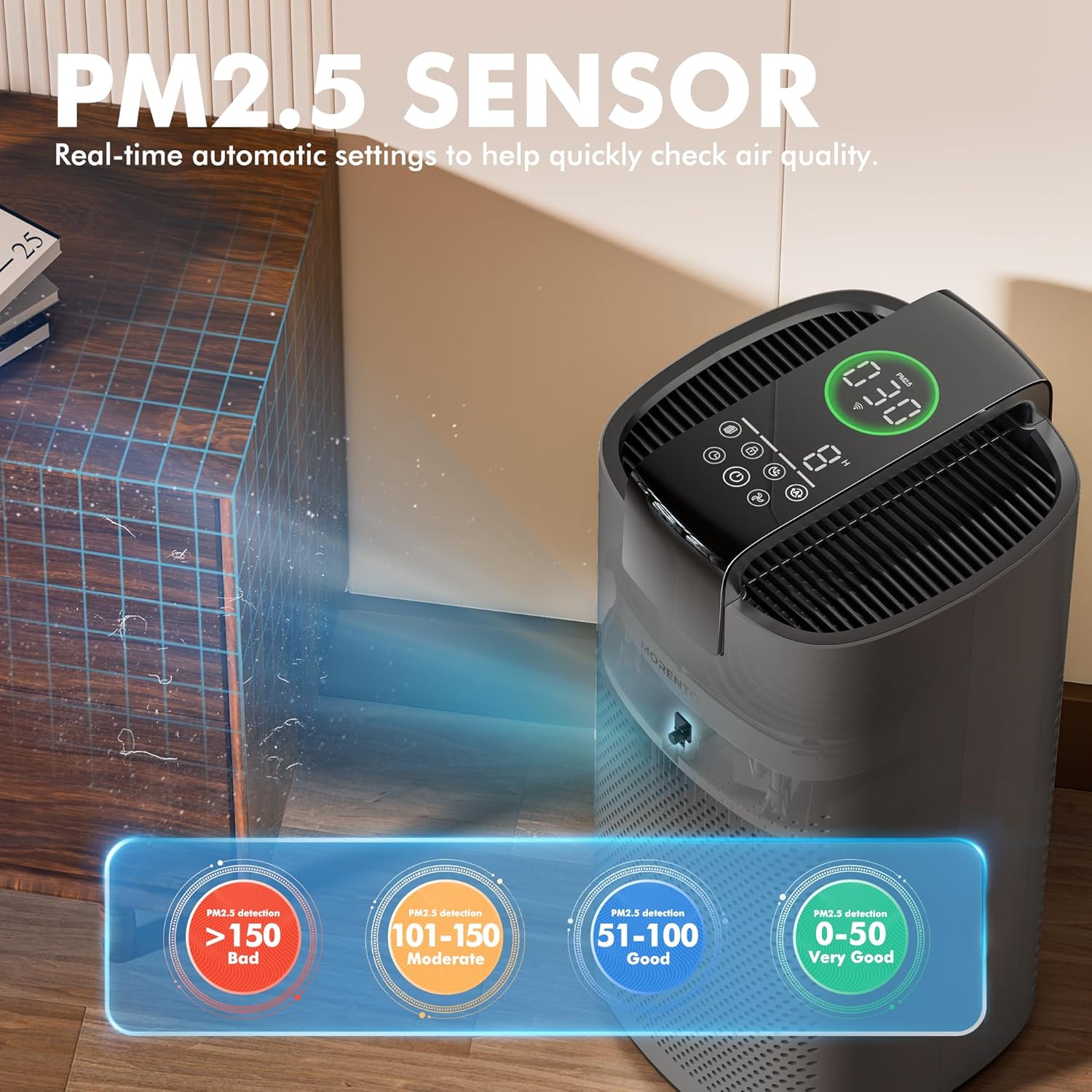 【Real-time Air Quality Detection】With the MORENTO air purifier’s PM2.5 sensor to control indoor air quality, it provides real-time detection of the air quality level, displays different ambient light to let you instantly know the cleanliness of the environment, while the air purifier’s automatic mode adjusts four wind speeds to purify the air