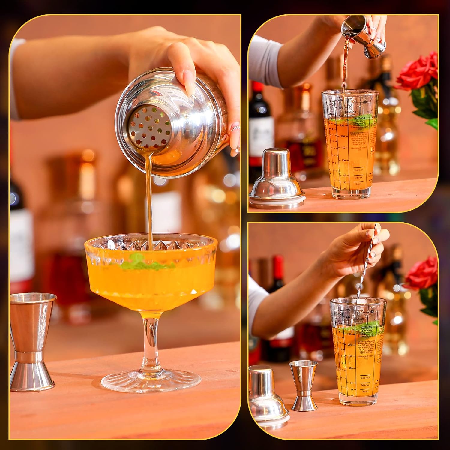 Durable and Safe: the drink shakers cocktail sets are mainly made of stainless steel and thick glass, reliable and sturdy, washable and reusable, not easy to break or deform, leak proof and high and low temperature resistant, and can serve you for a long time