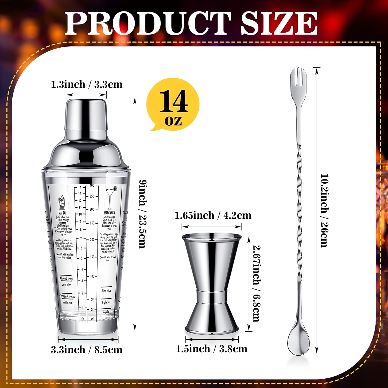 The martini glass shaker cup is approx. 9.25 inches/ 23.5 cm in height and approx. 3.35 inches/ 8.5 cm in bottom width, the spoon is approx. 10.24 inches/ 26 cm in length and the double jigger is approx. 2.68 inches/ 6.8 cm in height, suitable size for your use.