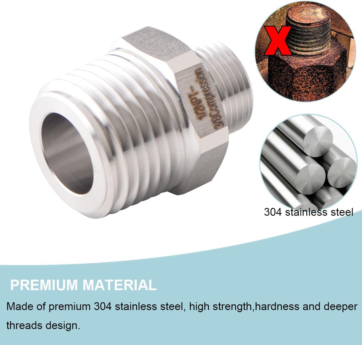 【FIRM AND DURABLE】This long-lasting 1/2 to 3/8 reducer is resistant to corrosion, thicker and stronger, with high-quality stainless steel construction, which is is 0.7’’ thicker than others. It is carefully processed to leak proof and anti-pressure, ensuring quality and longevity.