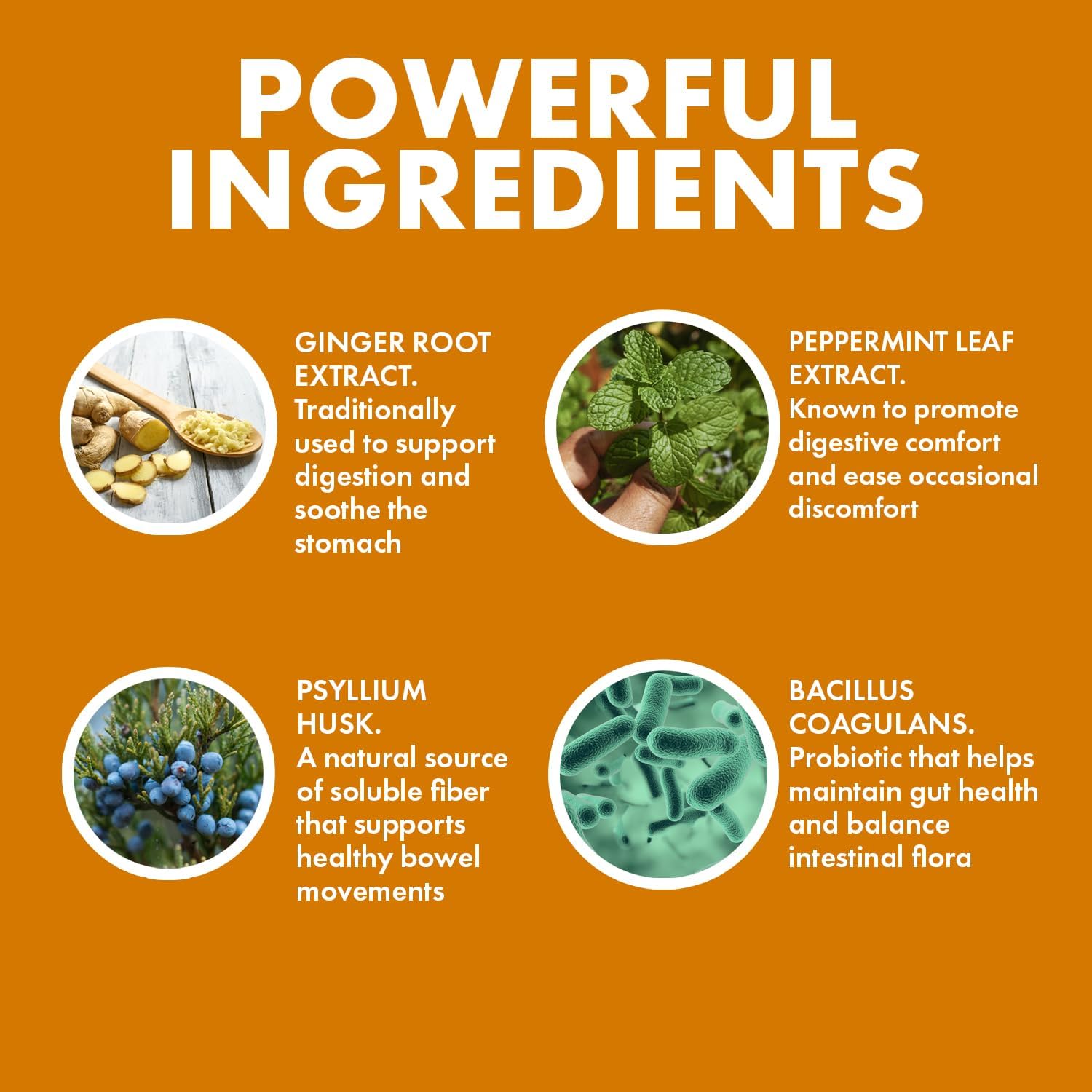 HIGH POTENCY: Our capsules have Ginger root extract, Peppermint leaf extract, and natural Fiber sources for an effective digestive supplement. These colon support vitamins also include probiotics known as Bacillus Coagulans – 1 billion colony-forming units (CFU) – that can be taken once per day and do not need refrigeration.